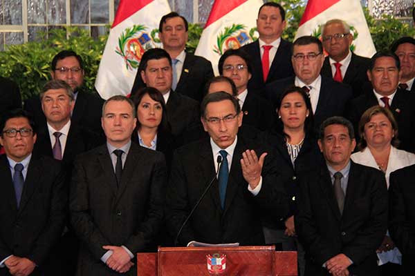 “El Gobierno ha decidido presentar cuestión de confianza respecto de las políticas de Estado de fortalecimiento institucional y lucha contra la corrupción”, anunció Vizcarra en mensaje a la nación, acompañado por su gabinete en pleno y la totalidad de los gobernadores regionales.