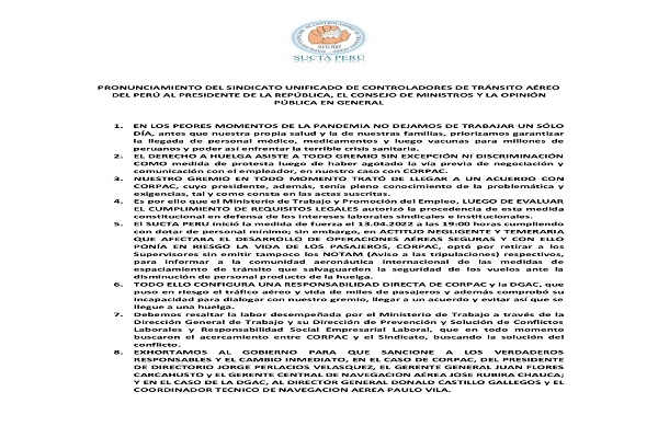 El Sindicato Unificado de Controladores Aéreos del Perú emitió hoy un comunicado respecto a la huelga que sostuvieron la semana pasada y que motivó la cancelación o postergación de vuelos nacionales e internacionales, indicando que en todo momento trataron de llegar a un acuerdo con la alta dirección de Corpac, pero que sus reclamos no fueron atendidos.