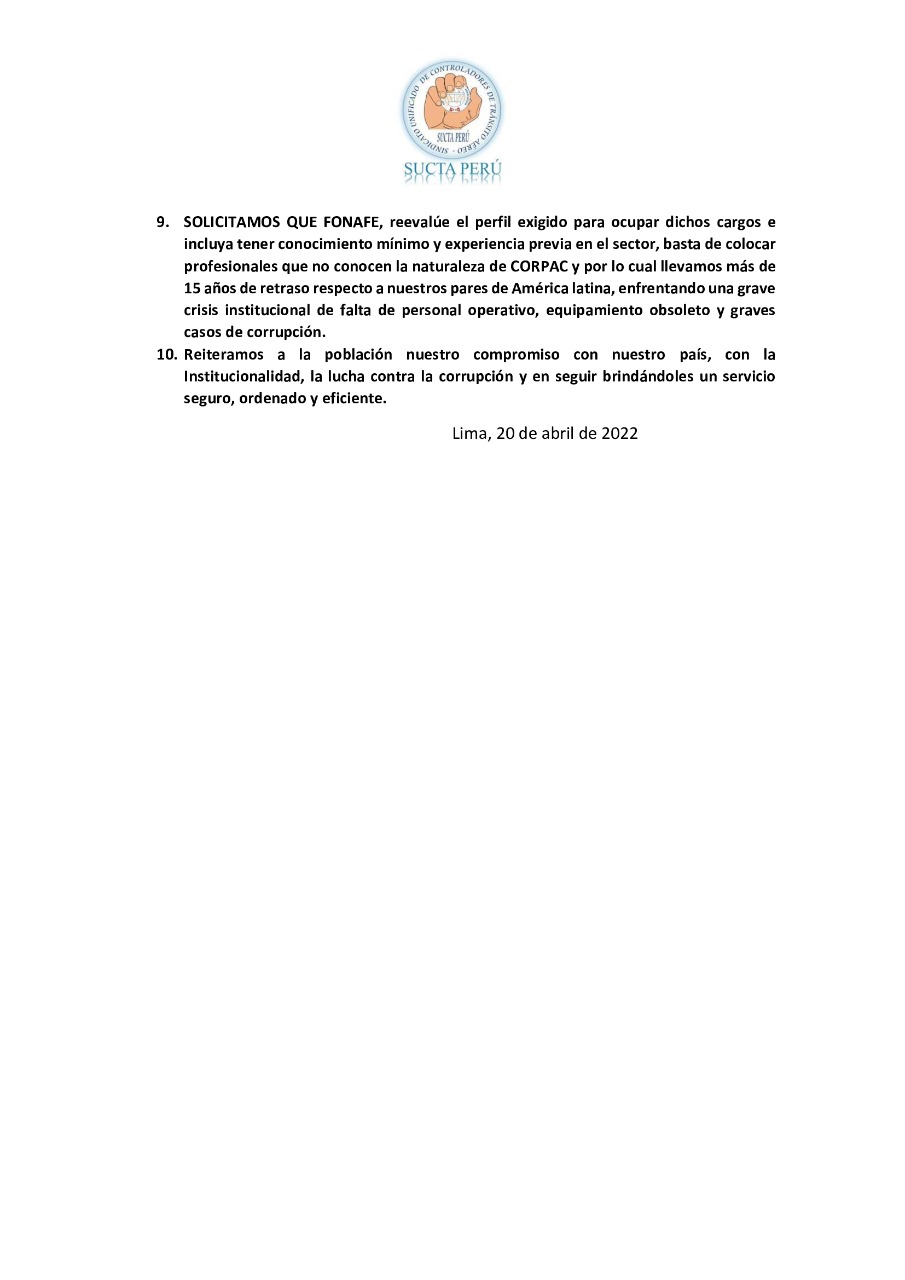 “Solicitamos a FONAFE reevalúe el perfil exigido para ocupar dichos cargos e incluya tener conocimiento mínimo y experiencia en el sector, basta de colocar profesionales que no conocen la naturaleza de Corpac”, concluye el comunicado.