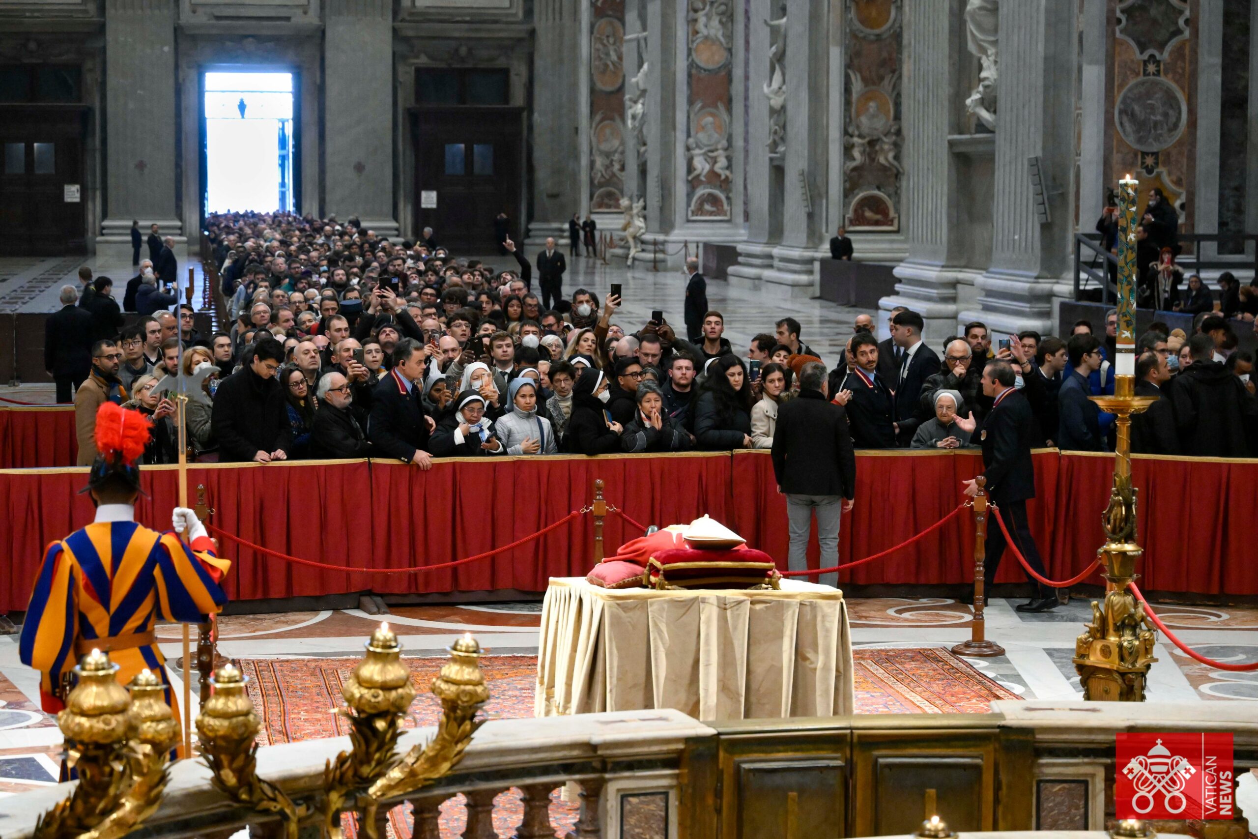 La basílica de San Pedro, donde reposan los restos del pontífice emérito Benedicto XVI, recibió este martes a cerca de 70.000 fieles en la segunda jornada de las tres que se prolongará la capilla ardiente, informó la gendarmería del Vaticano.