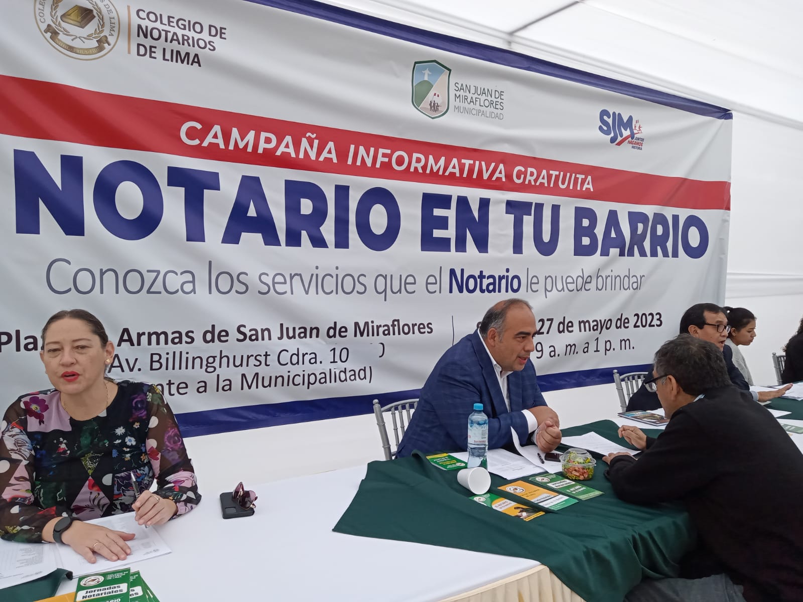 El Notario en tu Barrio tiene la finalidad de brindar información, orientar y proporcionar ayuda en trámites notariales a los vecinos. Durante el desarrollo de estas jornadas, los notarios (de modo presencial) absuelven las consultas de la población, en forma gratuita, en trámites tales como: legalización de firmas, compraventa de bienes muebles e inmuebles, testamento, sucesión intestada, prescripción adquisitiva de dominio, matrimonio en sede notarial, divorcio notarial, unión de hecho, etc.