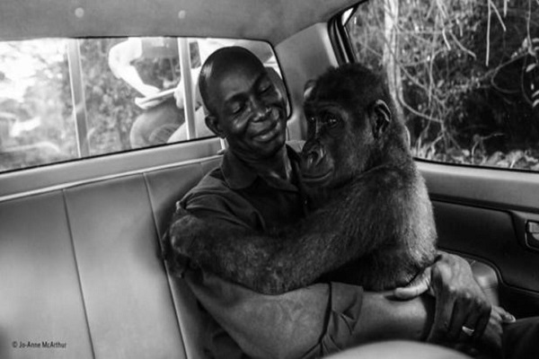 Es imposible mirar la fotografía sobre estas líneas y no esbozar una sonrisa. La misma que tiene este hombre, entre el cariño y la satisfacción del trabajo bien hecho, mientras sostiene en sus brazos, dentro de un coche, a una gorila. La historia, aunque dura, tiene también un final hermoso. «Pikin», una gorila de un santuario de Camerún, había sido capturada e iba a ser vendida para carne de animales silvestres, pero, por fortuna, pudo ser rescatada por la organización Ape Action Africa. La fotografía fue tomada cuando el primate estaba siendo trasladado de su antiguo recinto a uno nuevo y más grande, junto con un grupo de compañeros. Primero fue sedada, pero durante el traslado se despertó. Afortunadamente, no solo iba muy adormilada, sino que también estaba en los brazos de su cuidador, Appolinaire Ndohoudou, por lo que permaneció calmada durante todo el trayecto lleno de baches. Cómo se le agarra el animal resulta conmovedor. La imagen ha resultado ganadora por elección del publicó del prestigioso certamen Wildlife Photographer of the Year, que organiza cada año el Museo de Historia Natural de Londres.