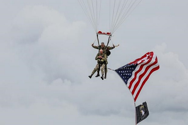 En representación de las fuerzas aerotransportadas de EE. UU., El veterano estadounidense Tom Ride también se lanzó en paracaídas en la cercana Carentan, Francia. «Fue perfecto, salto perfecto», dijo el veterano, de 97 años de edad. «Me siento muy bien. Subiría y lo haría todo de nuevo».